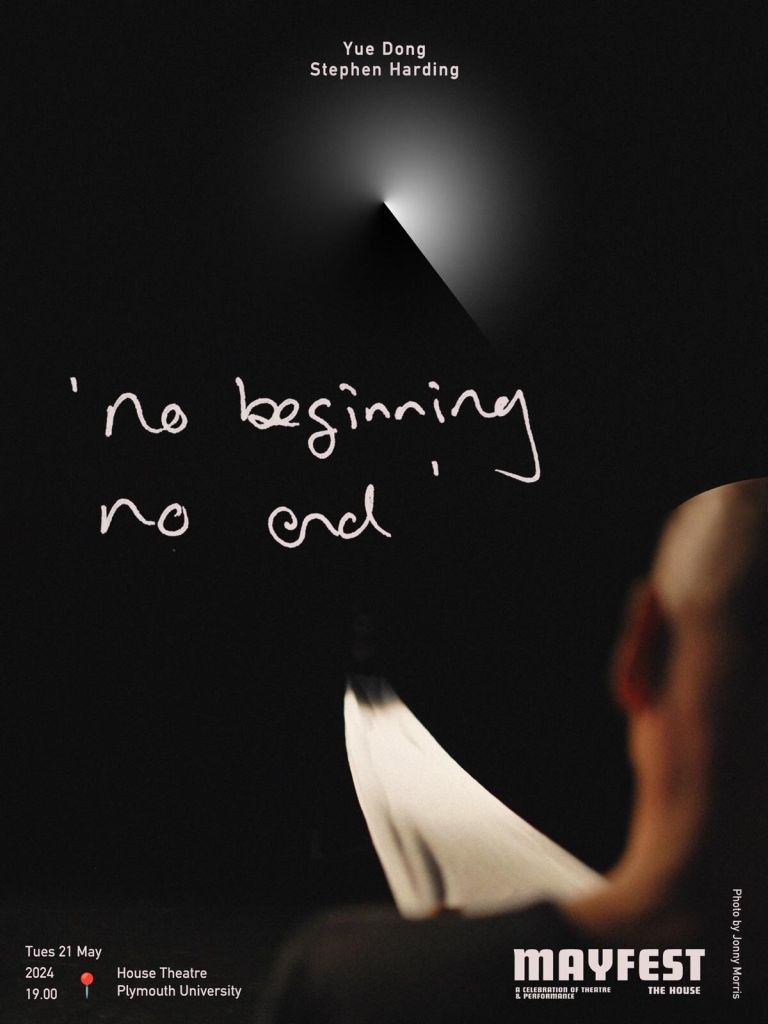 ‘No Beginning, No End’, a two-person multimedia performance, is a thought provoking, intense and cylindrical exploration of the infinite. The disciplined scope of the performance was evident in it’s minimalistic approach, using only a linen sheet, a bowl, a detailed soundscape, and the actors bodies as the main means of expression. This minimalist approach served not as a constraint but as powerful medium, enhancing the visceral quality of the show. The use of the linen sheet was inventive and nuanced. I particularly enjoyed it’s use to create a soft wave of air that rippled throughout the audience as the actors ran across the stage towards us, against the backdrop of a nature scene, (in perhaps a nod to the tubular existence of nature?) as it created an additional sensory experience that transcended the visual and auditory to engage touch. This simple yet profound gesture further symbolised the continuous, unending nature of circles, touching the senses and emphasising the themes inherent in the performance.