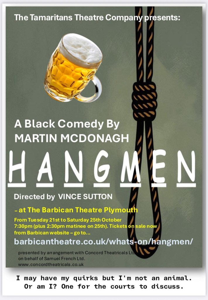Hangmen is a dark comedy by Martin McDonagh and premiered in 2015 at The Royal Court Theatre. It is set in 1965 and follows the story of Harry Wade who was an executioner (Hangman) for the courts until it was suspended in 1965.