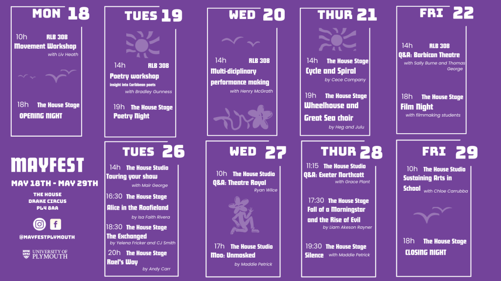 The festival includes public events and creative workshops, aimed at supporting emerging artists and artist development, attracting new audiences, and creating a platform for networking between students, alumni, and industry professionals. Reviews of Mayfest Plymouth 2026 will be posted below!